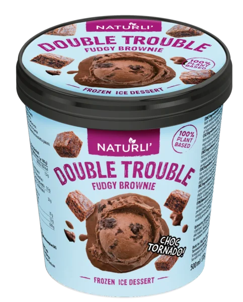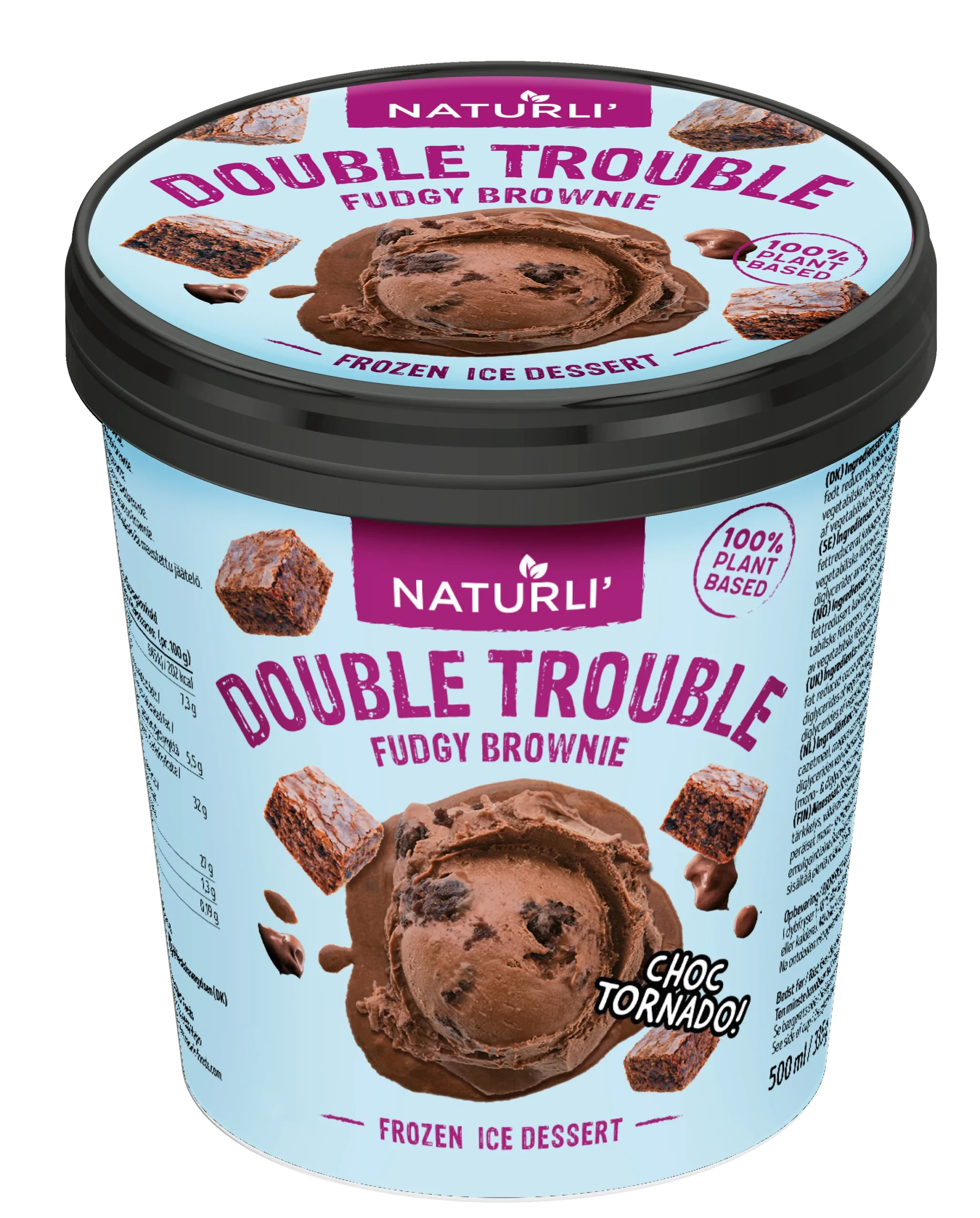 Double Trouble is a 100 % plant based combination of creamy cocoa ice and generous pieces of fudgy brownie the oven of our own plant-bakery. An alarmingly great duo. Soft and edible directly from the freezer! … and don’t worry, you wont get any trouble from us if you take two.